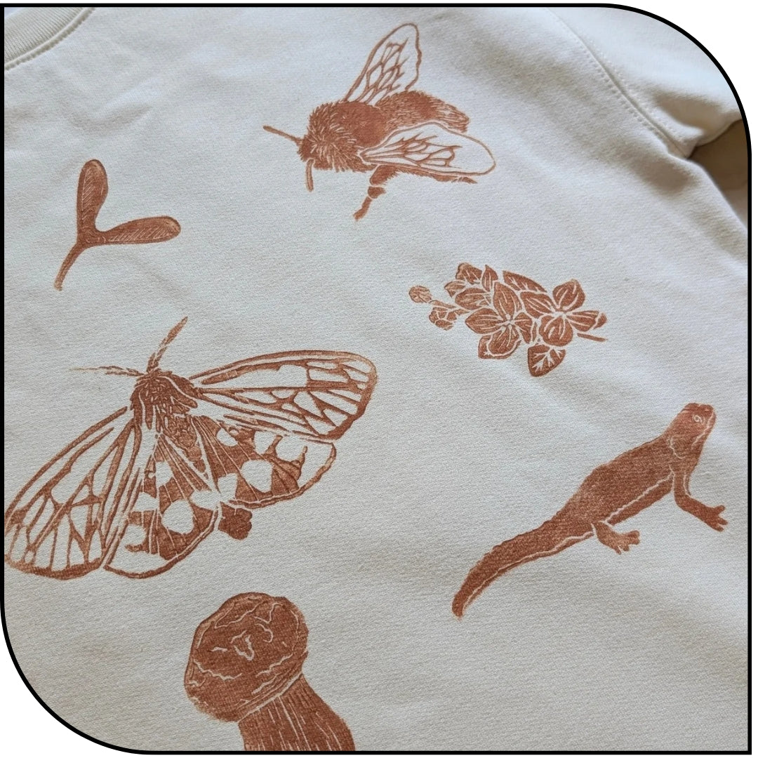 Cream Tone 50% Cotton/ 50% polyester crew neck sweaters print in white using carved lino blocks. Available in sizes s-2xl on hand, if you are interested in additional sizing please email us directly, we would love to make it happen!